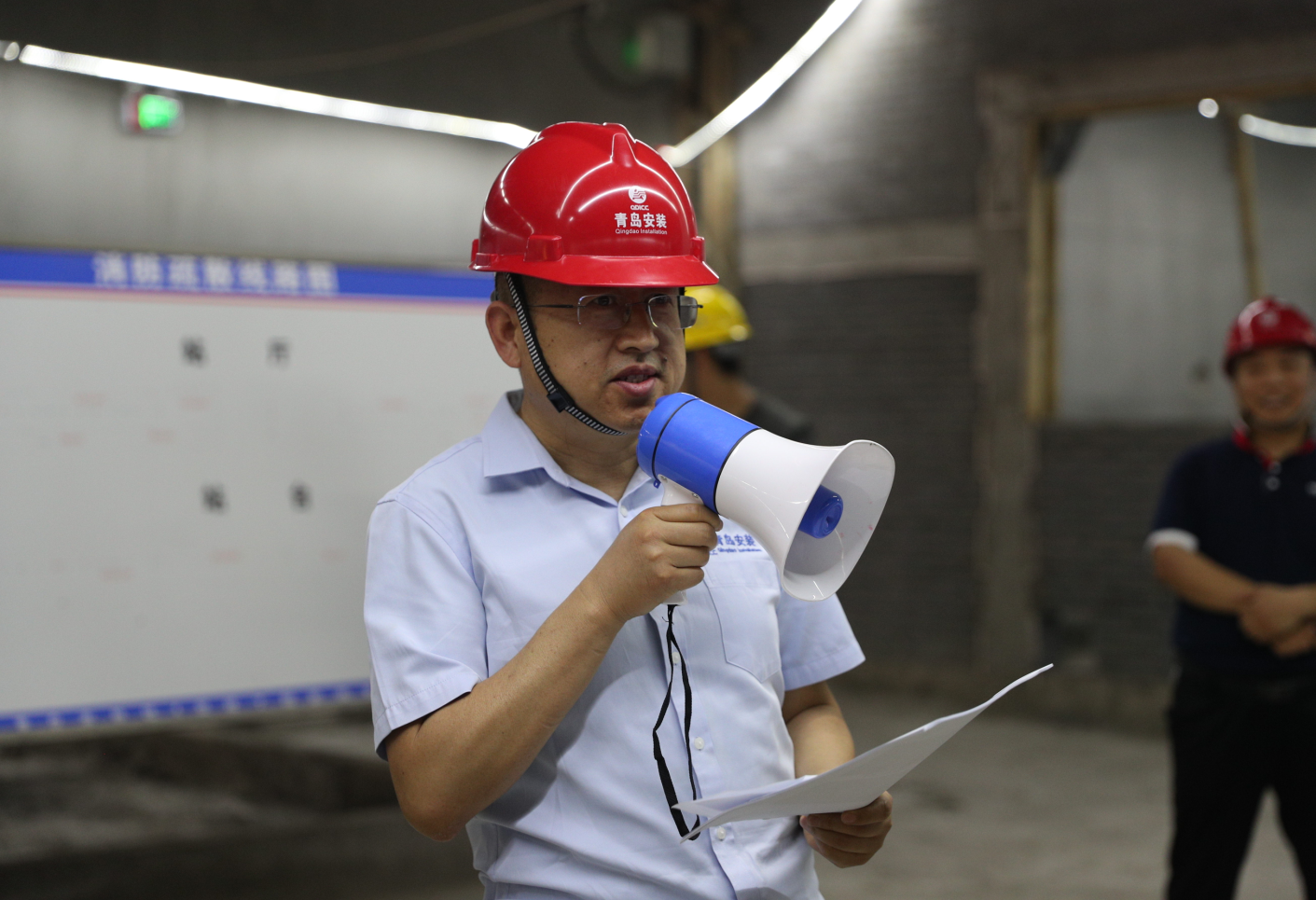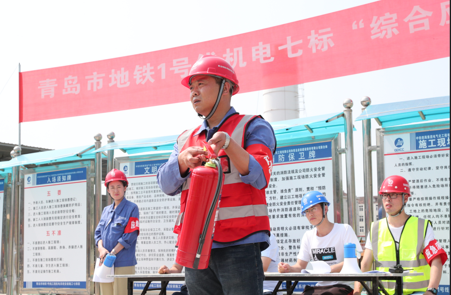 為扎實開展2019年“安全生產月”活動,牢固樹立“生命至上,安全生產”理念,全面提升安全生產事故應急救援處置能力,2019年6月14日下午,我公司聯合中鐵四局地鐵項目部在青島市地鐵1號線工程機電系統施工七標段遵義路站站區開展了一次以“防風險 除隱患 遏事故”為主題的安全生產事故應急救援綜合演練活動,公司黨委書記、常務副總經理張衛財出席活動,安環部主任馬世革、中鐵四局、監理公司、各分公司負責安全生產的副經理、專職安全員及安環部全體人員共計80余人到現場觀摩演練。中鐵四局青島地鐵1號線機電七標項目經理劉洋擔任演練總指揮。公司商務經理姜曉紅擔任主持人。